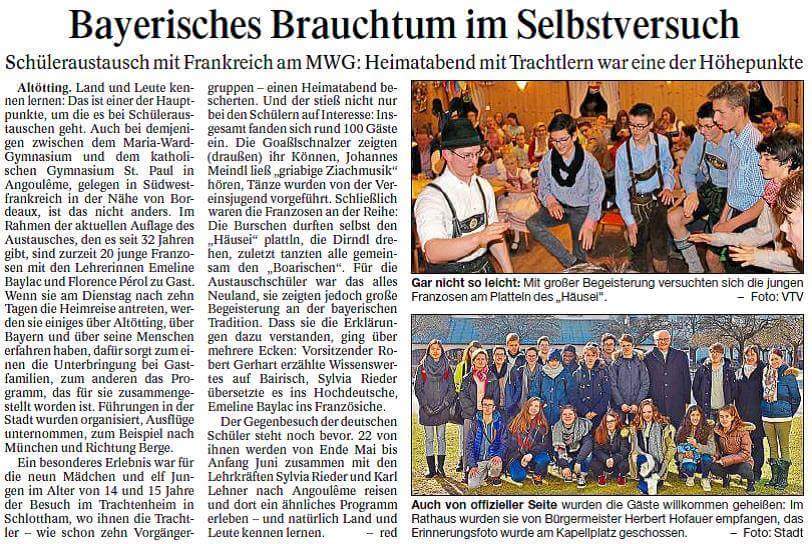 Le journal local d’Altötting s’est fait l’écho de notre échange avec la ville, cela est également paru sur leur page Facebook. Voici donc la photo de cet article et sa traduction pour les non germanophones (merci à Mme PEROL pour ce travail) :