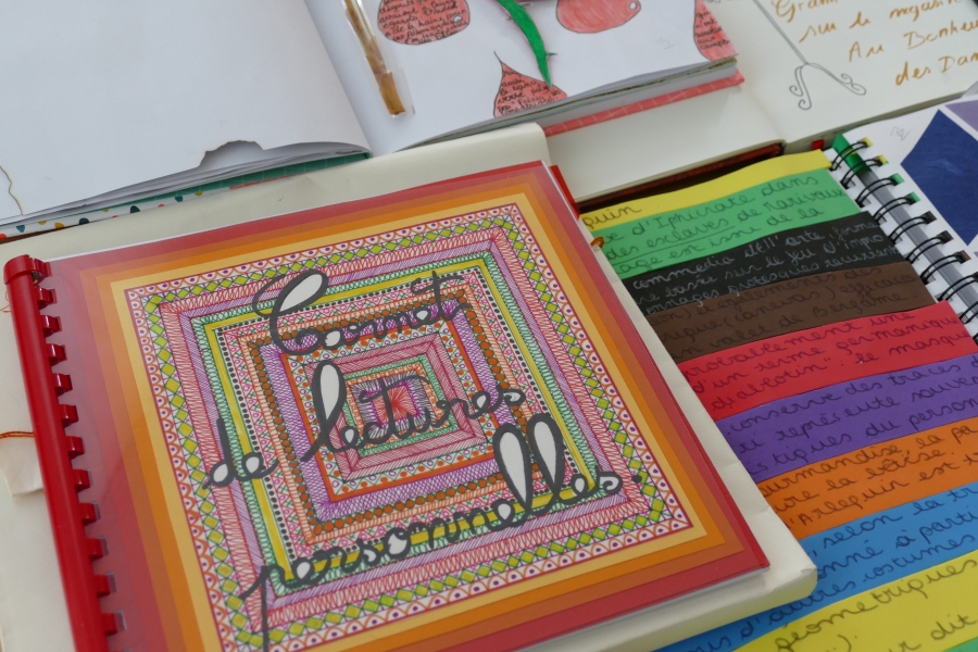 Page de garde, production littéraire et même marque-page doivent faire l’objet d’un travail plastique. C’est par là que passe l’appropriation. Les techniques sont donc très variées : dessin, collage, peinture, encre, fusain, etc.