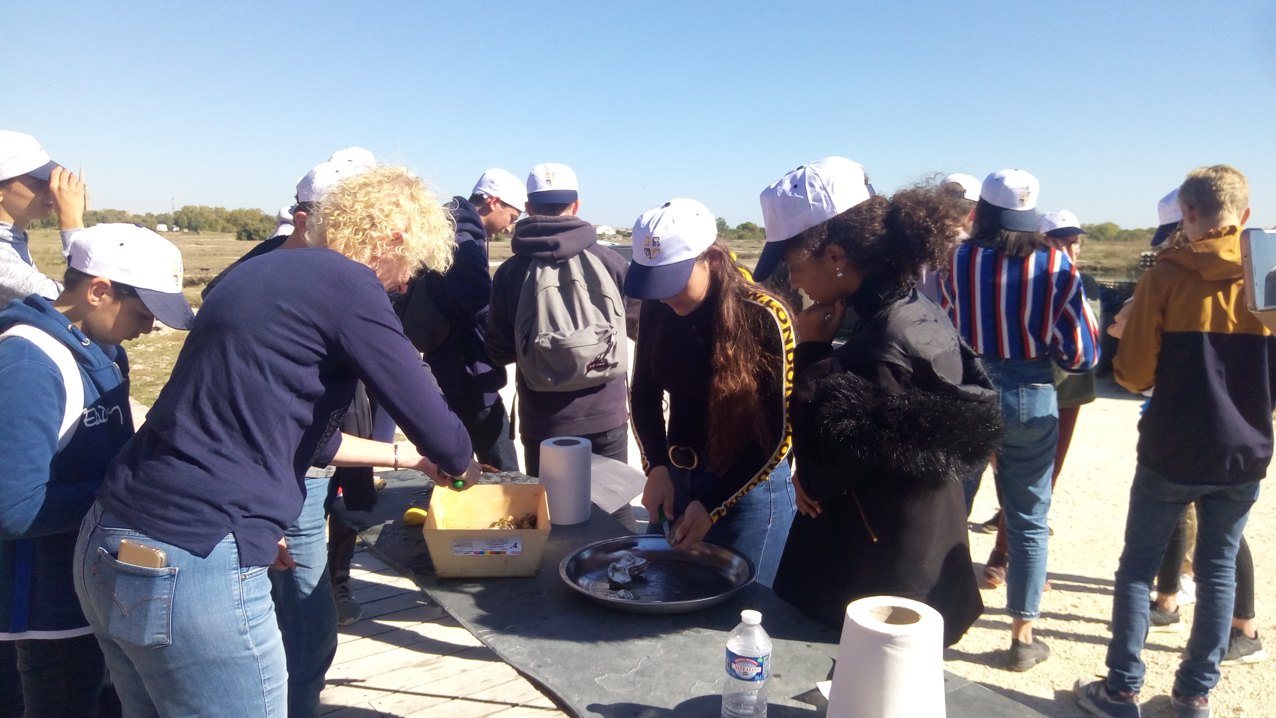Les groupes se répartissent alors sur les différents ateliers. Les casquettes offertes par l’ESPACE sont très appréciées et utiles pour reconnaître nos jeunes en fonction des classes. Top départ : direction le “Port des salines” pour les uns, la pratique de la voile pour les autres et la “Cité de l’huître” pour le troisième groupe. Ciel bleu et soleil : des conditions idéales que chacun apprécie en ce début d’automne.