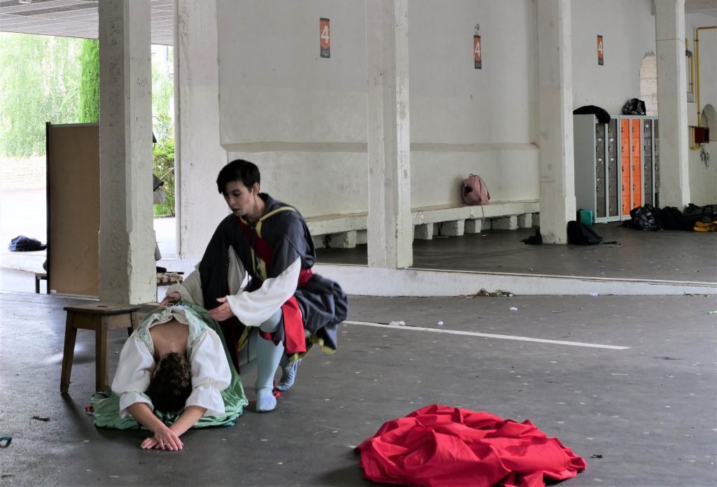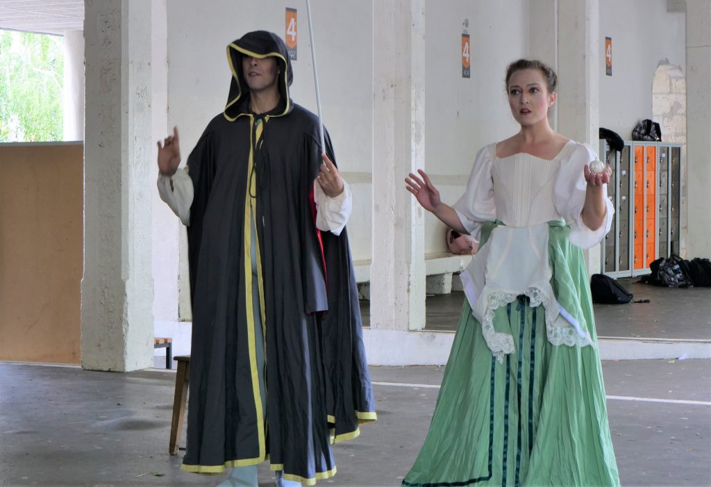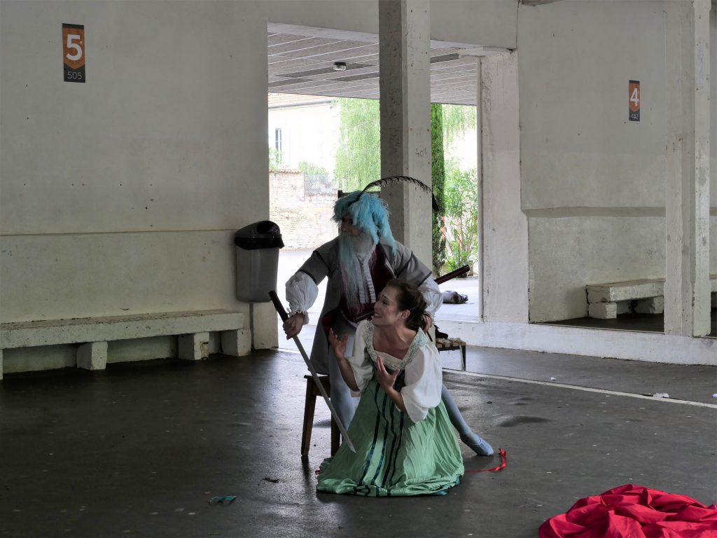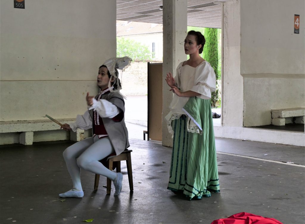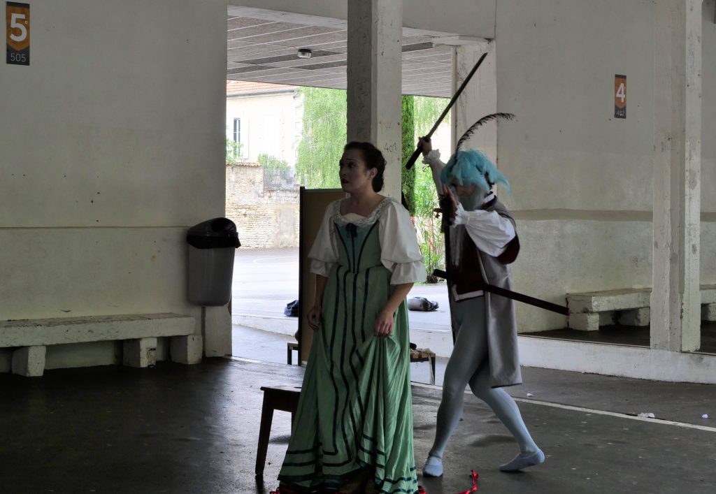 Le théâtre baroque présente une diction particulière puisque les mots sont accentués, les consonnes finales rendues sonores, cela répond à la rhétorique alors en cours à l’époque, elle a pour but de renforcer le sens du discours et elle s’accompagne d’une gestuelle qui, elle aussi, en accentue la valeur. Les comédiens ont bravé les éléments puisqu’ils ont joué en plein air, et, en raison de la pluie, sous le préau balayé par le vent. Des conditions ingrates parfois puisqu’elles ne facilitaient pas l’acoustique. Néanmoins, ces artistes, aguerris aux conditions de jeu rudimentaires, (en effet, ils jouent par principe sans sonorisation et sans éclairage) ont fait découvrir à ce jeune public, surpris mais conquis, une forme de théâtre ignorée : celle de la frontalité directe, du verbe qui manifeste sa puissance par lui-même, sans jamais chercher à entrer dans la psychologie chère à la dramaturgie moderne.