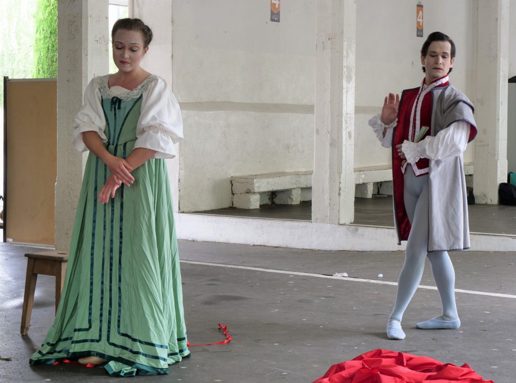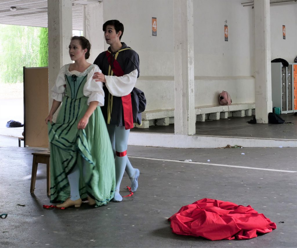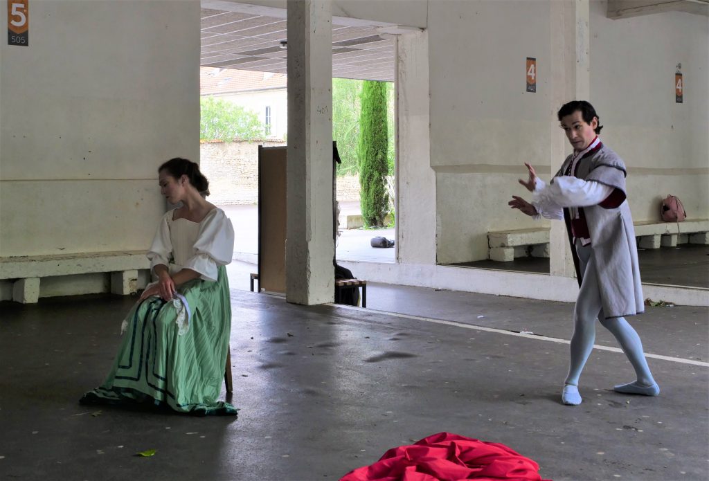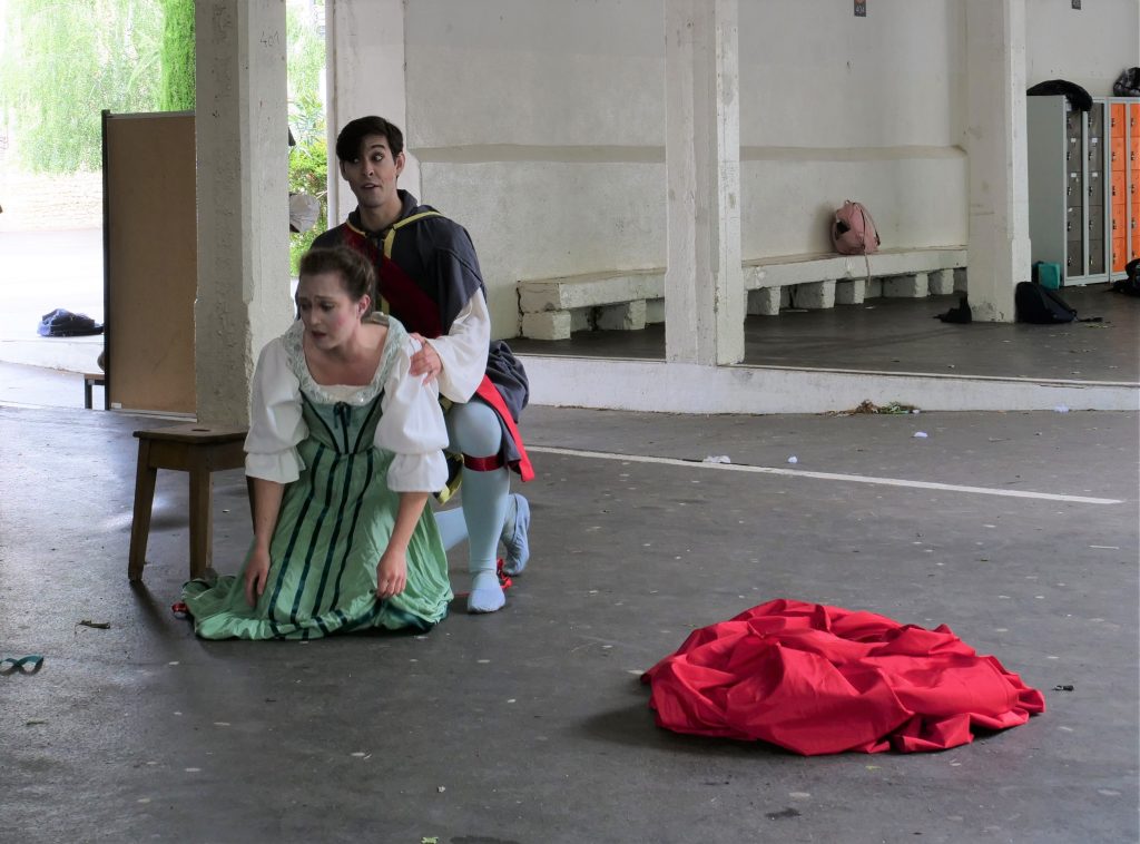 Le théâtre baroque présente une diction particulière puisque les mots sont accentués, les consonnes finales rendues sonores, cela répond à la rhétorique alors en cours à l’époque, elle a pour but de renforcer le sens du discours et elle s’accompagne d’une gestuelle qui, elle aussi, en accentue la valeur. Les comédiens ont bravé les éléments puisqu’ils ont joué en plein air, et, en raison de la pluie, sous le préau balayé par le vent. Des conditions ingrates parfois puisqu’elles ne facilitaient pas l’acoustique. Néanmoins, ces artistes, aguerris aux conditions de jeu rudimentaires, (en effet, ils jouent par principe sans sonorisation et sans éclairage) ont fait découvrir à ce jeune public, surpris mais conquis, une forme de théâtre ignorée : celle de la frontalité directe, du verbe qui manifeste sa puissance par lui-même, sans jamais chercher à entrer dans la psychologie chère à la dramaturgie moderne.