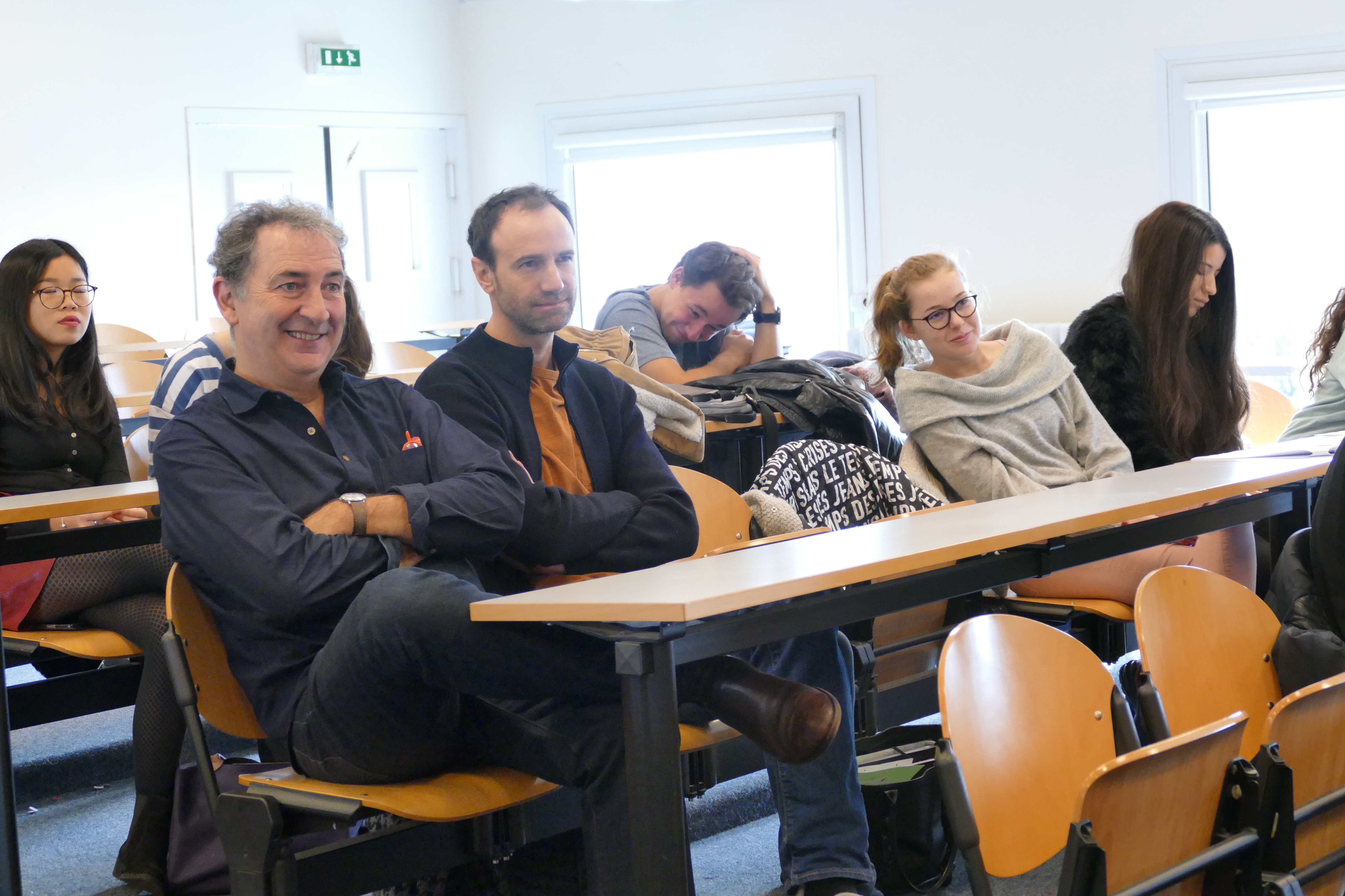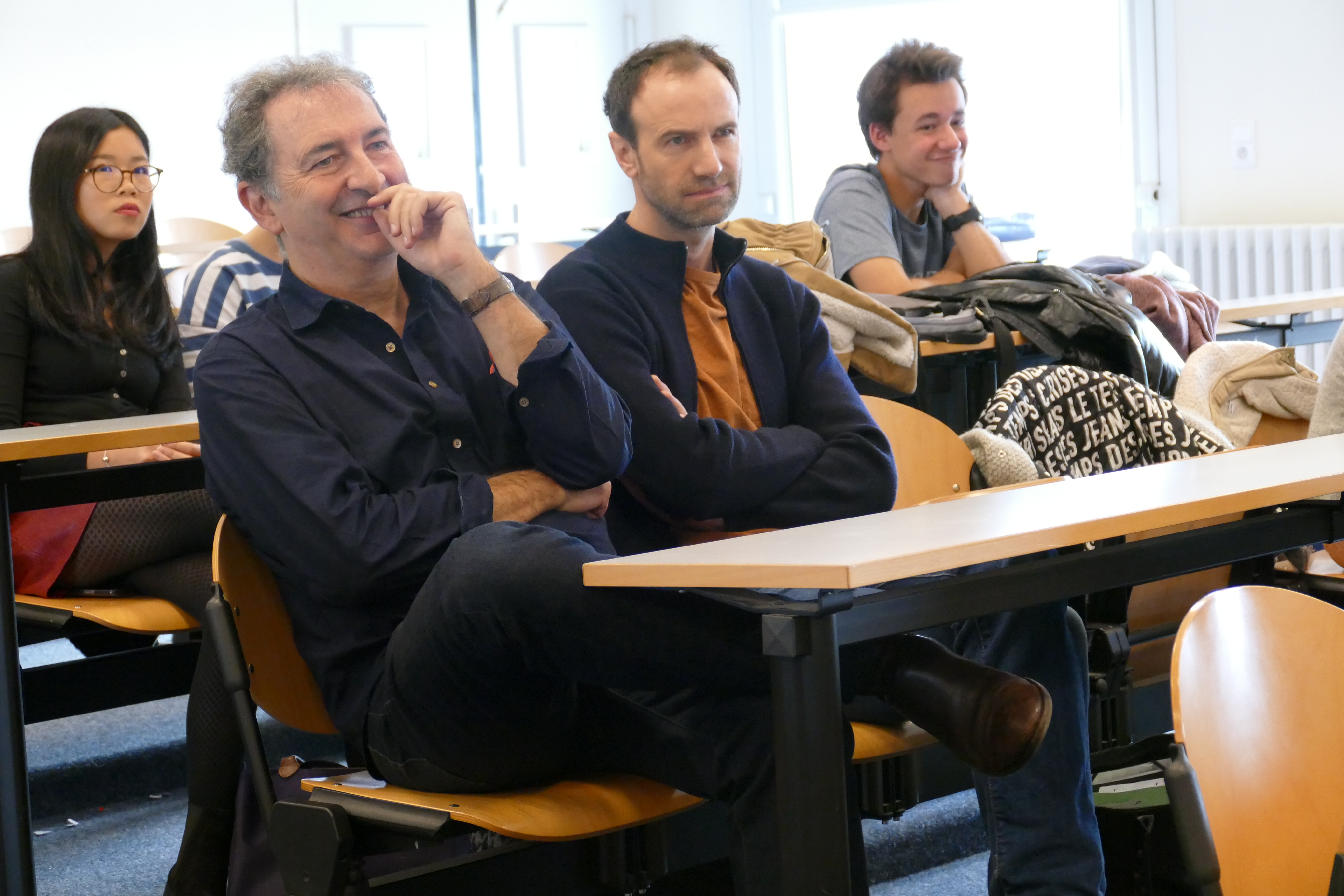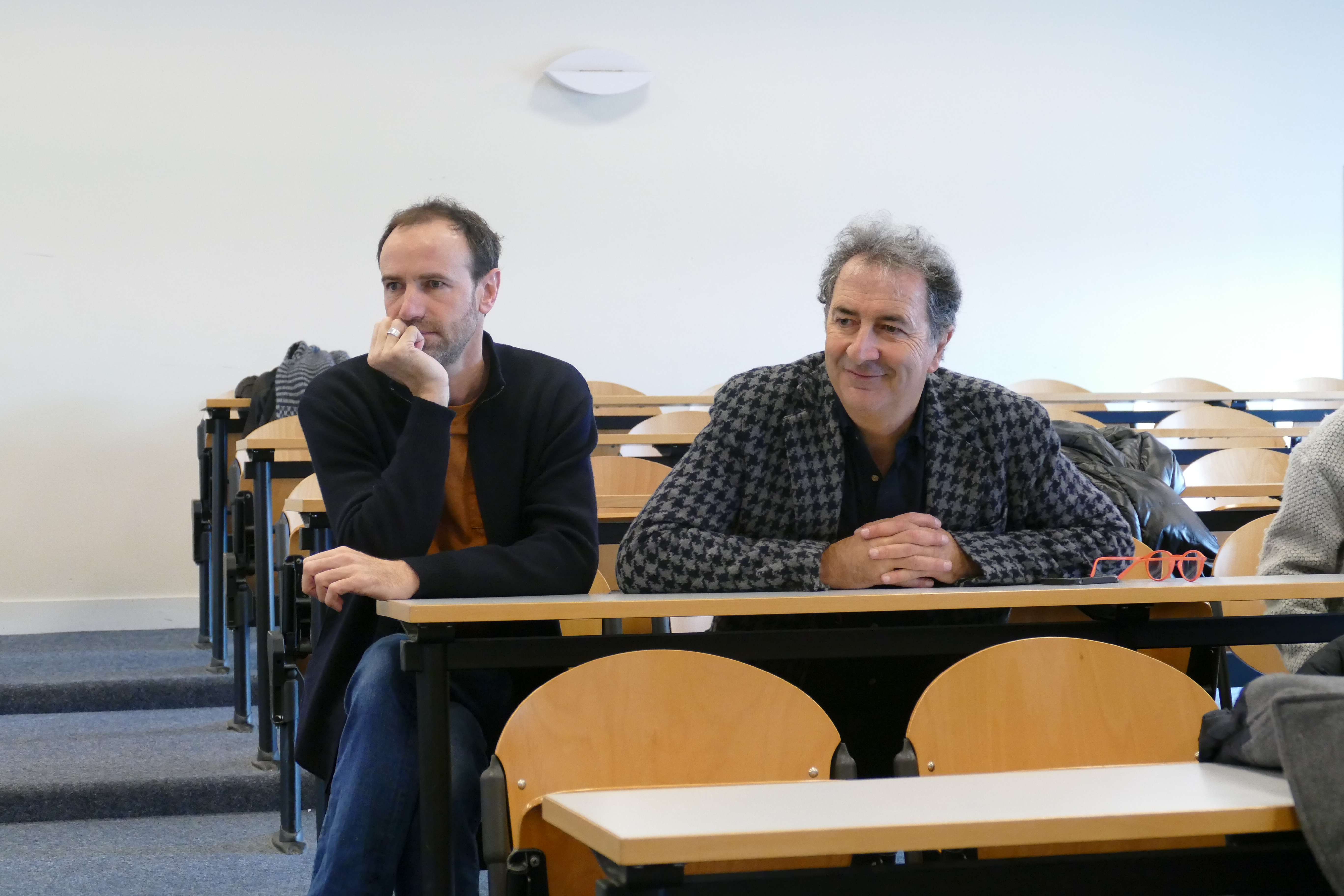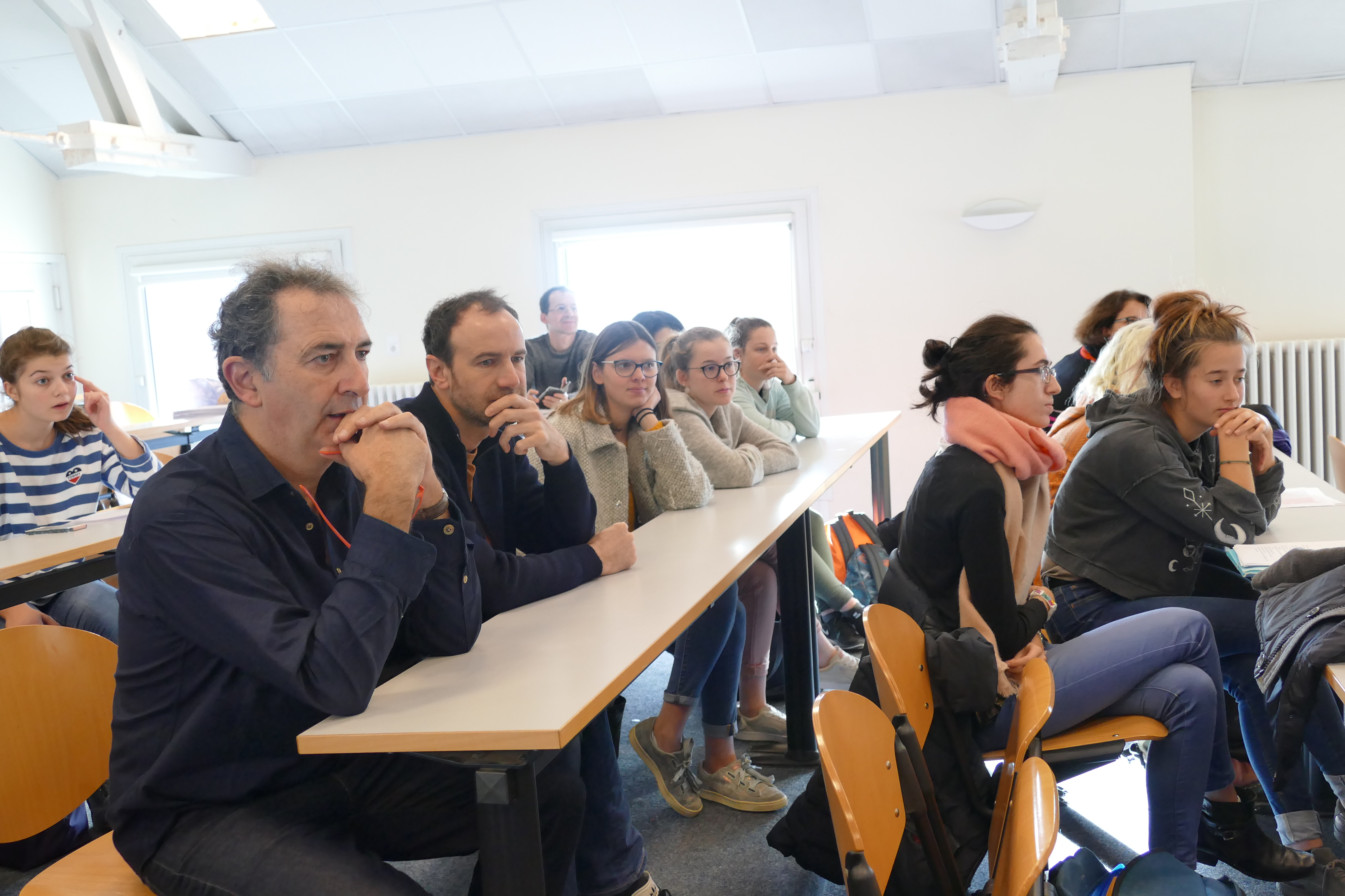 Accompagné de Romain LEMIRE (comédien, auteur et chanteur) il s’assied au milieu des jeunes dans l’amphithéâtre et, pendant plus d’une heure, il regarde, sourit, conseille et même rit sans oublier d’encourager nos jeunes artistes en herbe.