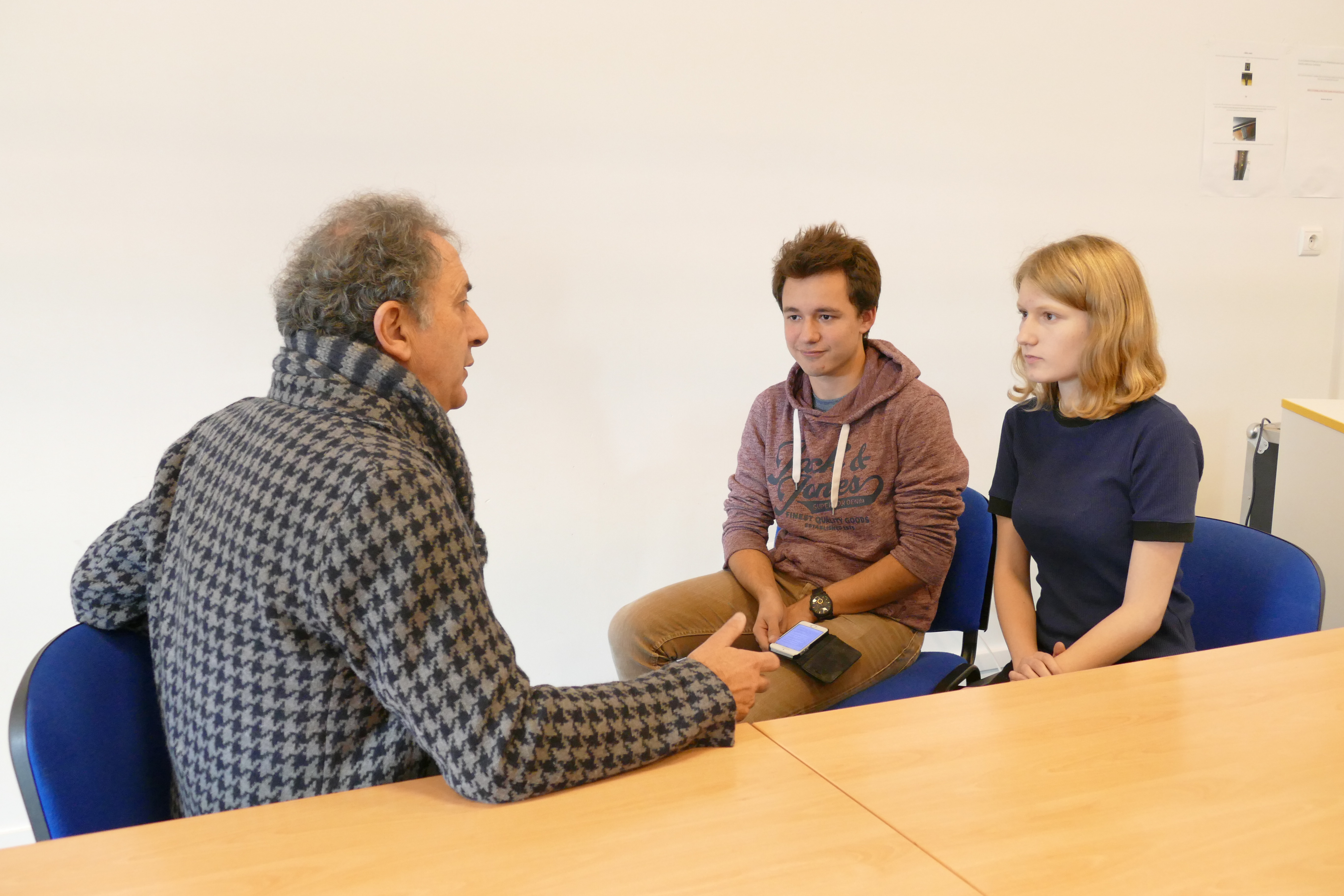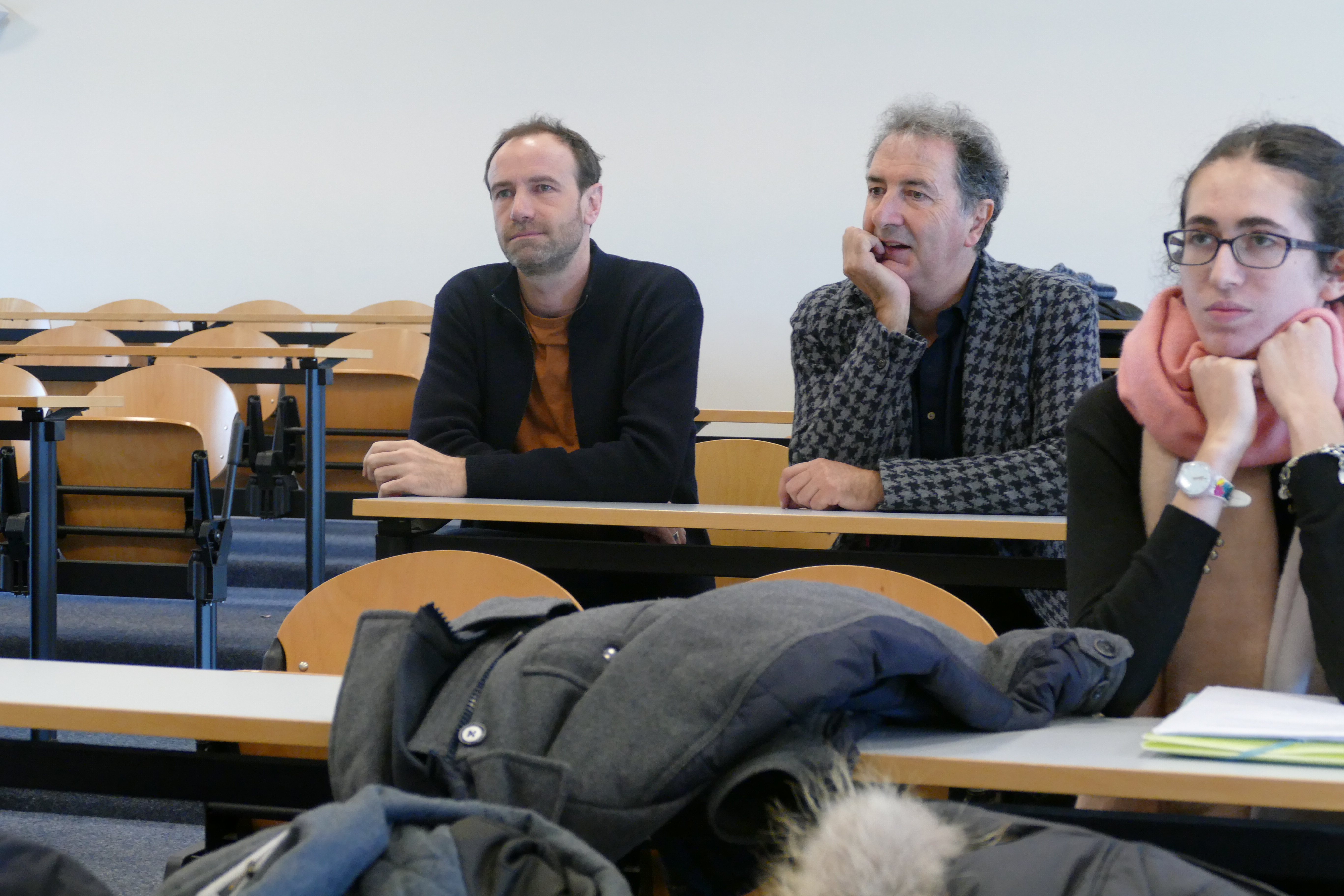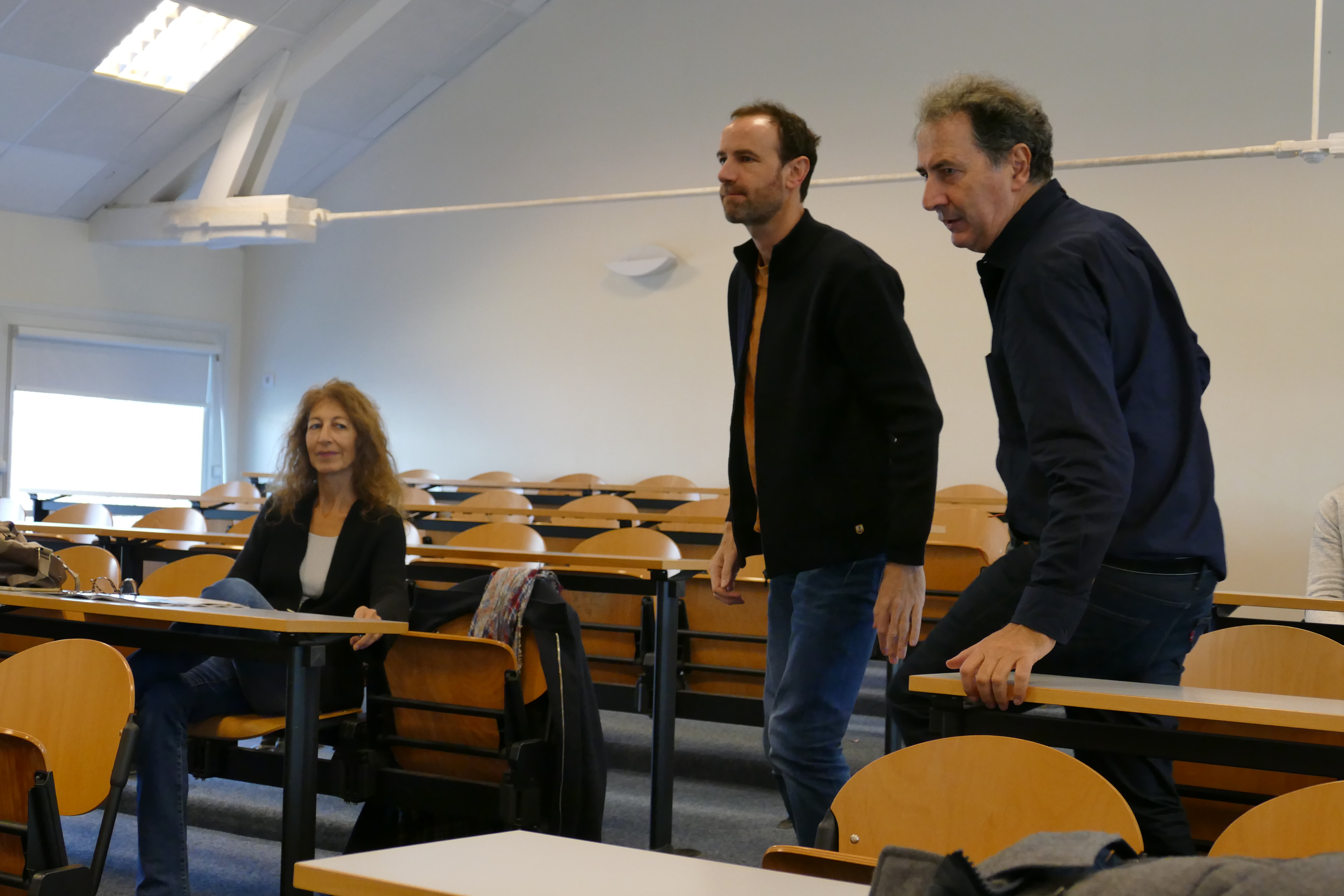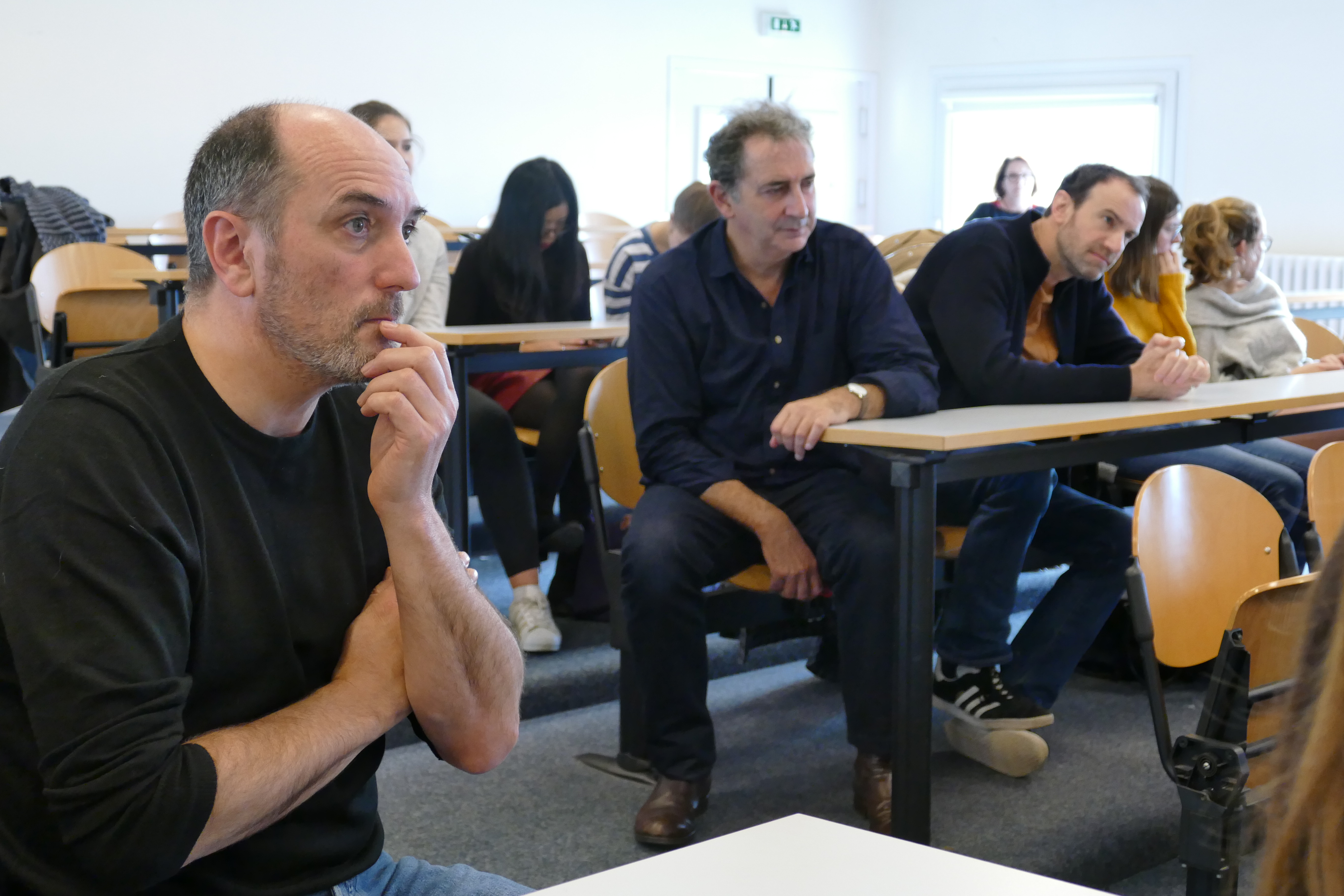 Accompagné de Romain LEMIRE (comédien, auteur et chanteur) il s’assied au milieu des jeunes dans l’amphithéâtre et, pendant plus d’une heure, il regarde, sourit, conseille et même rit sans oublier d’encourager nos jeunes artistes en herbe.
