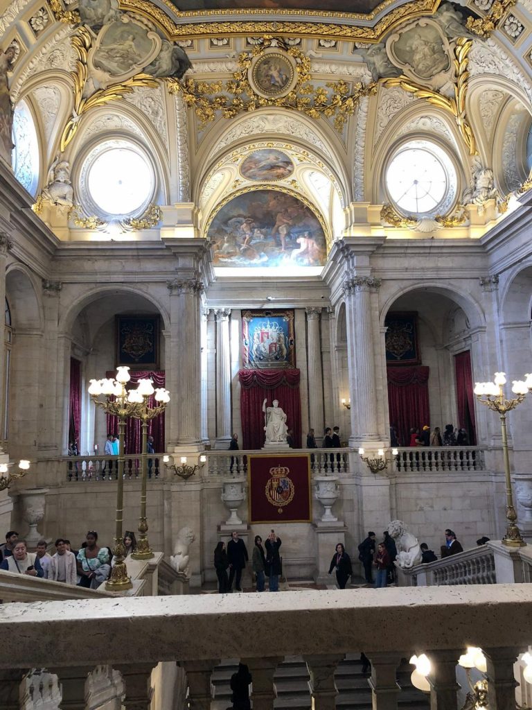 Une fois d’attaque nous découvrons à pied le Centre-ville sous un magnifique soleil. L’heure du déjeuner arrive et c’est au restaurant que nous prenons notre repas. La gastronomie locale change de l’ordinaire et c’est très sympathique. L’après-midi nous visitons librement le Palais Royal (ou “Palacio Real”). Il est l’une des résidences officielles du Roi (même s’il n’y habite plus). Des manifestations protocolaires y ont encore lieu. Inspiré de l’architecture du Louvre, il comporte plus de 3 000 pièces !