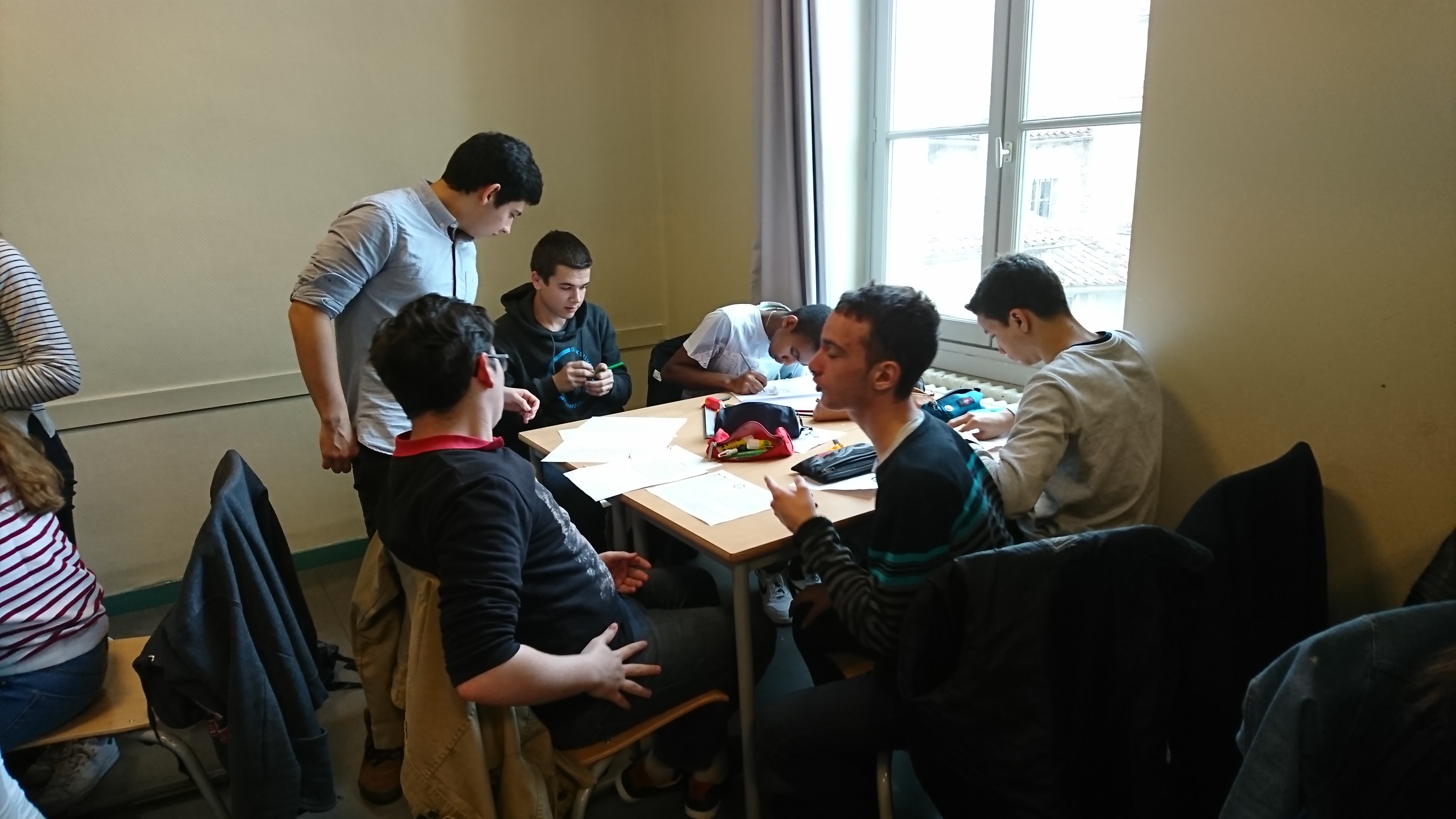 Ceux qui ont fait des recherches en amont se réunissent pour constituer le dossier à remettre. Les autres élèves forment des petits groupes pour résoudre les différents problèmes. Dès qu’un exercice est réalisé, d’autres équipes se penchent sur d’autres problèmes. Tout cela est donc très dynamique ! Deux élèves « leaders » animent ce temps, s’assurent que tout se passe dans les règles et s’enchaine bien. Ils passent de table en table afin de récupérer, au fur et à mesure, les différentes productions.