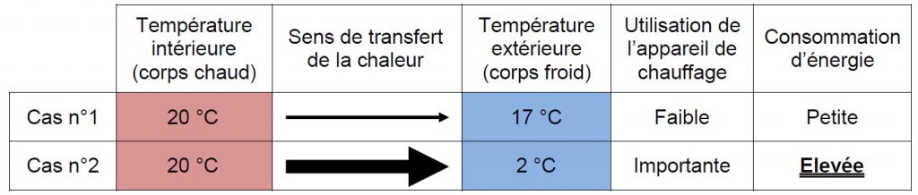 Transfert d’énergies : La chaleur traverse les parois et se transmet d’un corps chaud à un corps froid. Pour garder une température ambiante confortable, l’appareil doit compenser les pertes de chaleur.