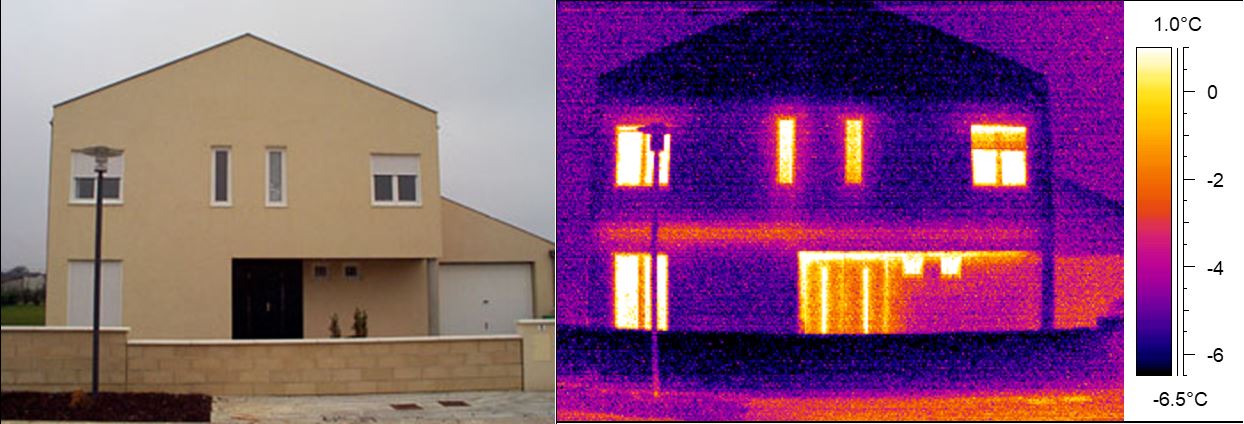 Sur l’image infrarouge, plus la zone va vers la couleur jaune/blanc, plus les déperditions de chaleur sont importantes. Dans ce cas, le haut du toit ainsi que les planchers bas sont des zones de fortes déperditions de chaleur (certainement un défaut d’isolation).