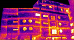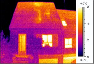 Sur l’image infrarouge, plus la zone va vers la couleur jaune/blanc, plus les déperditions de chaleursont importantes. Dans ce cas, le haut du toit ainsi que les planchers bas sont des zones de fortes